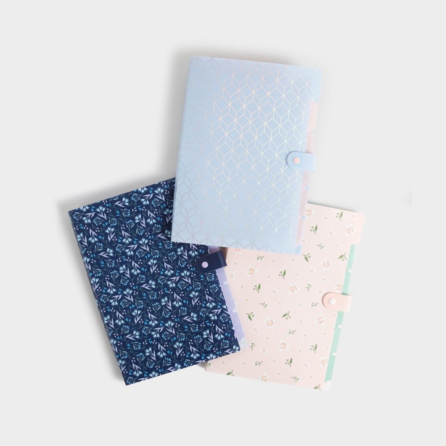Set of 3 expandable file folders | Holds standard 8.5" x 11" paper | Made of durable, non-toxic and waterproof poly material | 5 pockets | 6 tabs for convenient labeling and identification | Secure snap button closure | 3 unique Elevated Patterns designs | Paper part of packaging is FSC-certified (FSC® License Code: FSC-C152115) | Item ID: 3450U01-12