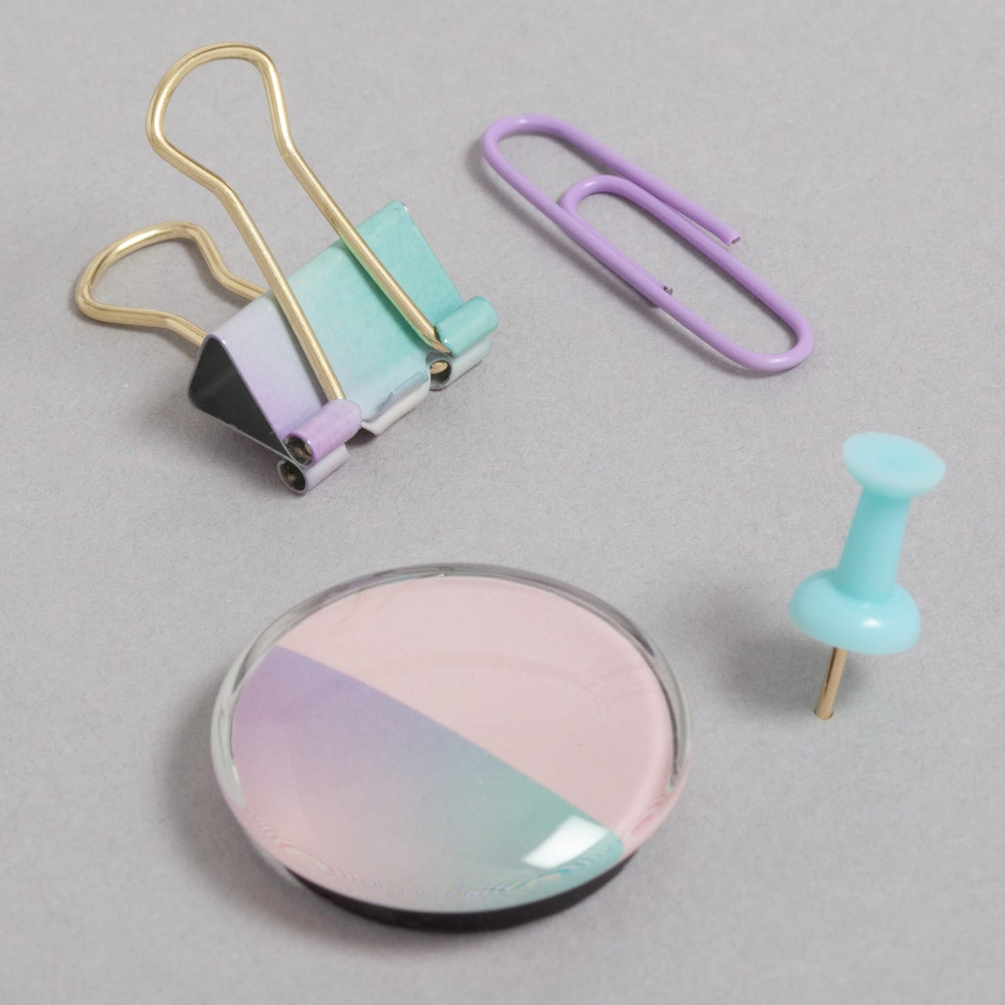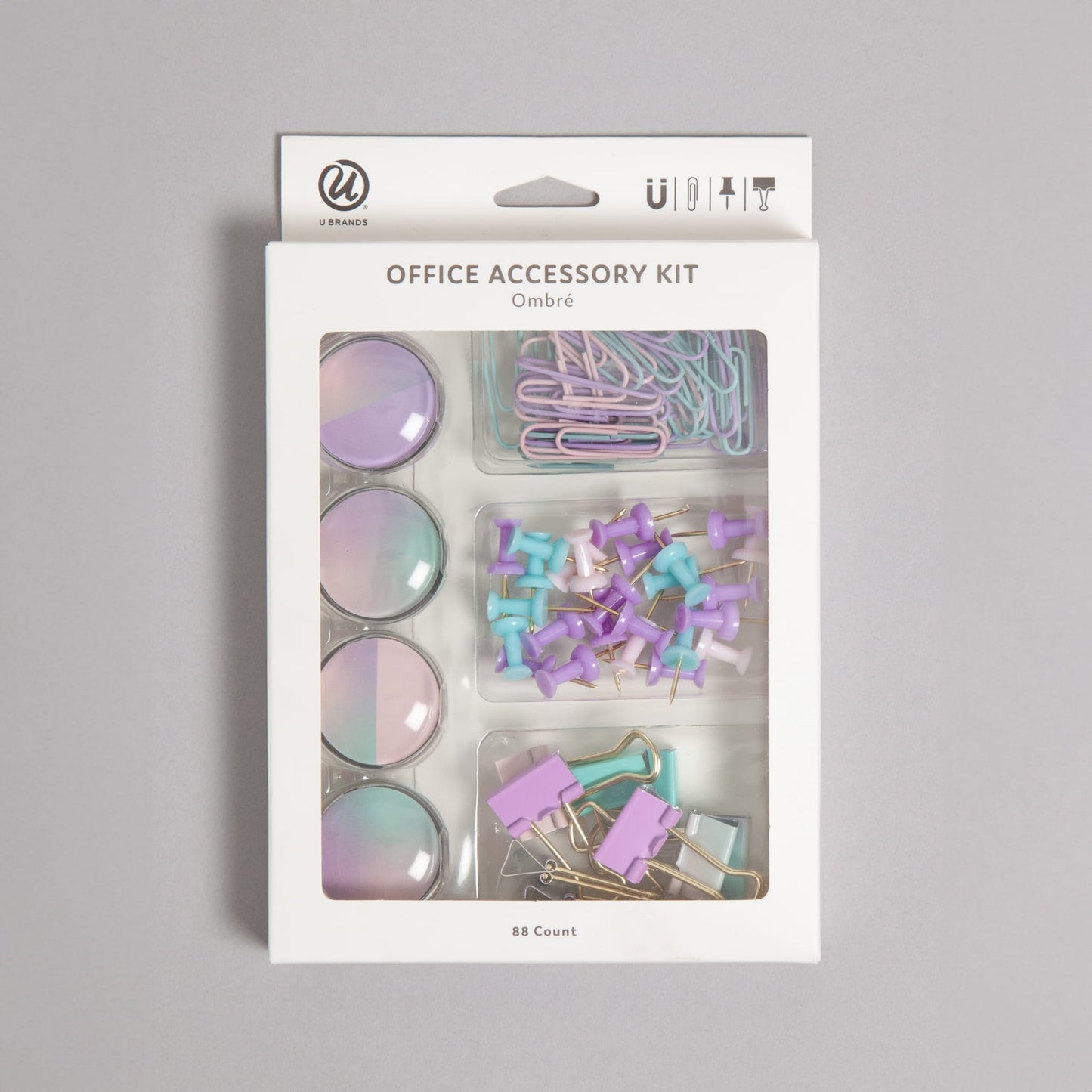 Set of 88 office accessories | 4 Round Glass Magnets, 9 Small (19mm) Binder Clips, 25 Standard (23mm) Push Pins, 50 Standard (32mm) Paper Clips | Each magnet holds up to 4 sheets of standard 8.5" x 11" paper | Binder clips and pins made from high-quality steel | Paper clips made of coated high-quality steel | Great for color-coding your papers | Unique ombre design and pastel colors | Parts of product are FSC Certified (FSC® License Code: FSC-C152115) | Item ID: 4368U06-24