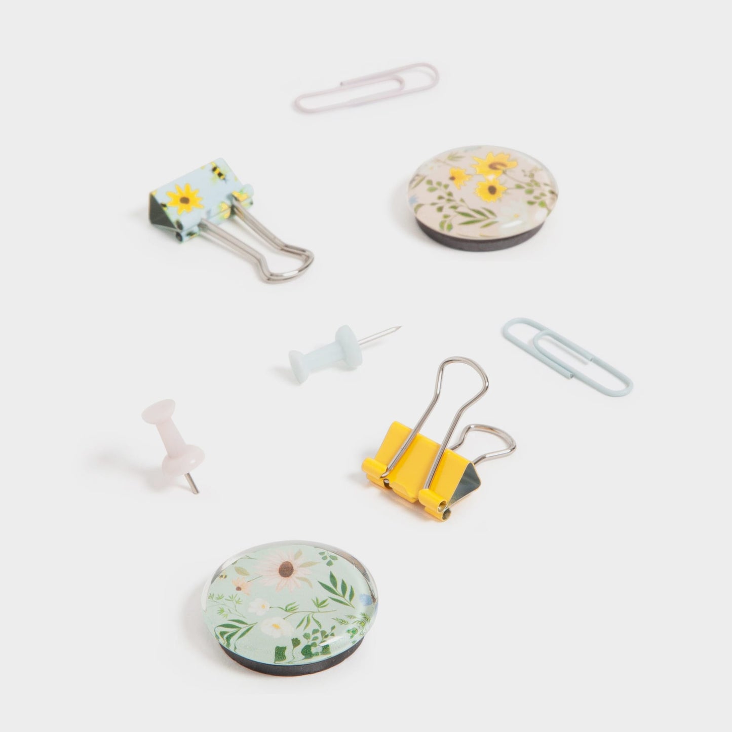 Set of 68 office accessories | 2 Round Glass Magnets, 6 Small (19mm) Binder Clips (3 Solid, 3 Printed), 24 Standard (23mm) Push Pins, 36 Standard (33mm) Paper Clips | Each magnet holds up to 4 sheets of standard 8.5" x 11" paper | Binder clips made from high-quality steel | Paper clips made of coated high-quality steel | 2 unique designs and 3 solid colors | Packaging is made from FSC-certified material (FSC® License Code: FSC-C152115) | Item ID: 6062U06-24