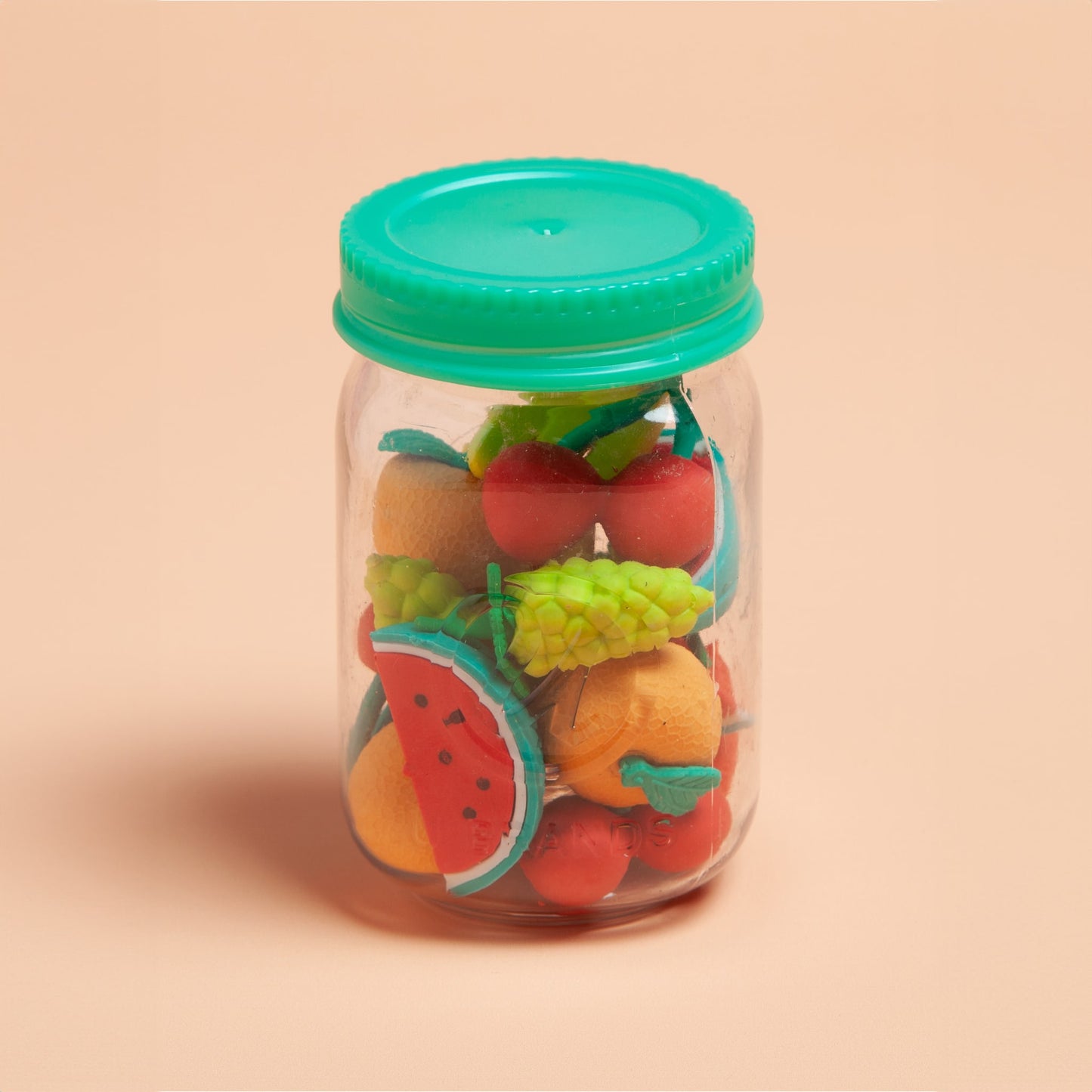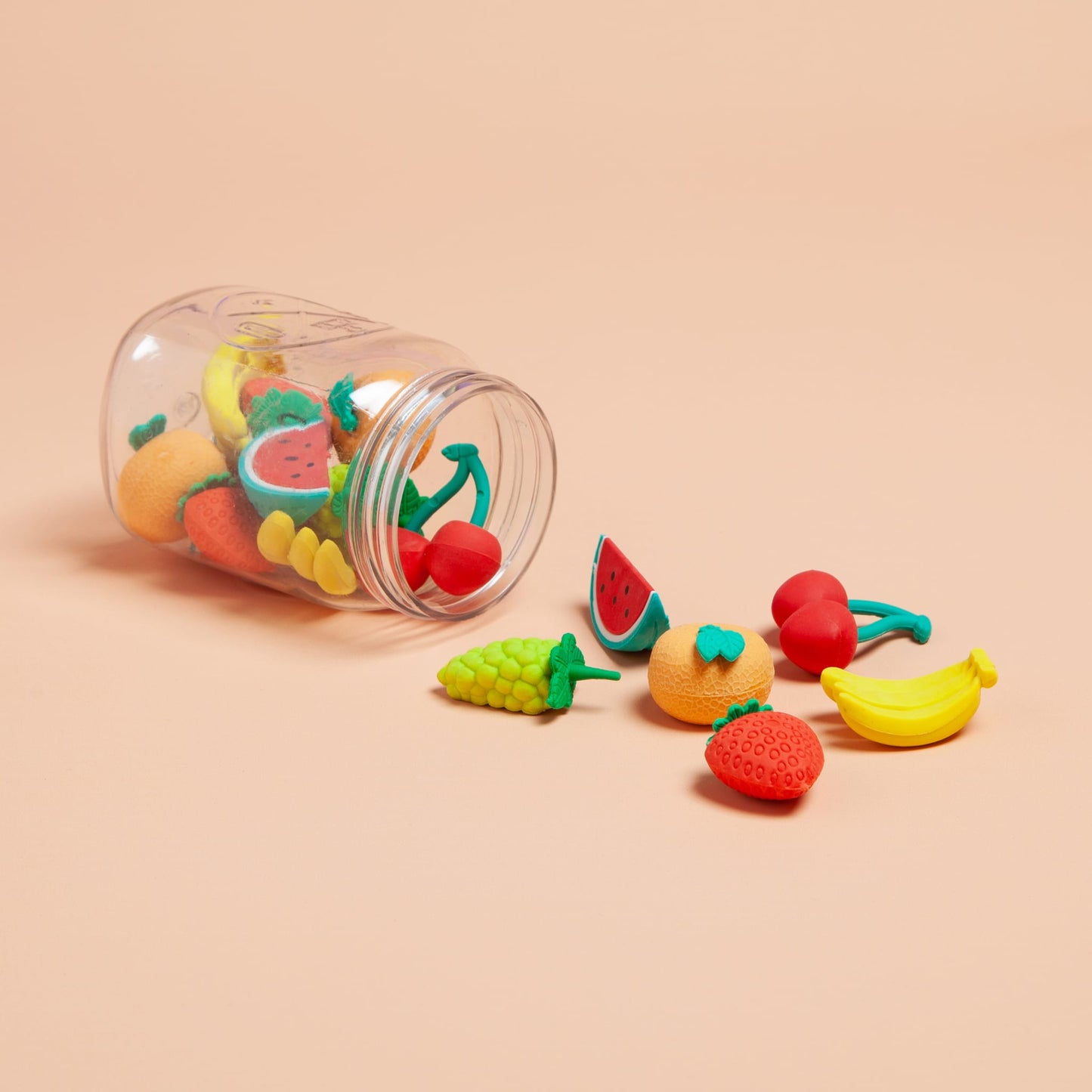 Set of 18 erasers | 3 watermelons, 3 strawberries, 3 oranges, 3 bananas, 3 grapes, and 3 cherries | Reusable mini mason jar for convenient storing | 6 unique fruit-shaped designs | Paper part of packaging is FSC-certified (FSC® License Code: FSC-C152115) | Item ID: 6529U06-24